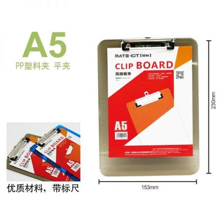 采用優(yōu)質(zhì)材料,加厚板體,柔韌性好,不易破裂,牢固耐用;板面印有標(biāo)尺刻度,突顯易讀取。帶掛孔,可以懸掛。有效利用空間,方便拿取。采用鍍鎳五金夾,不生銹夾力強(qiáng),夾紙不留痕。A5 23*15.3cm